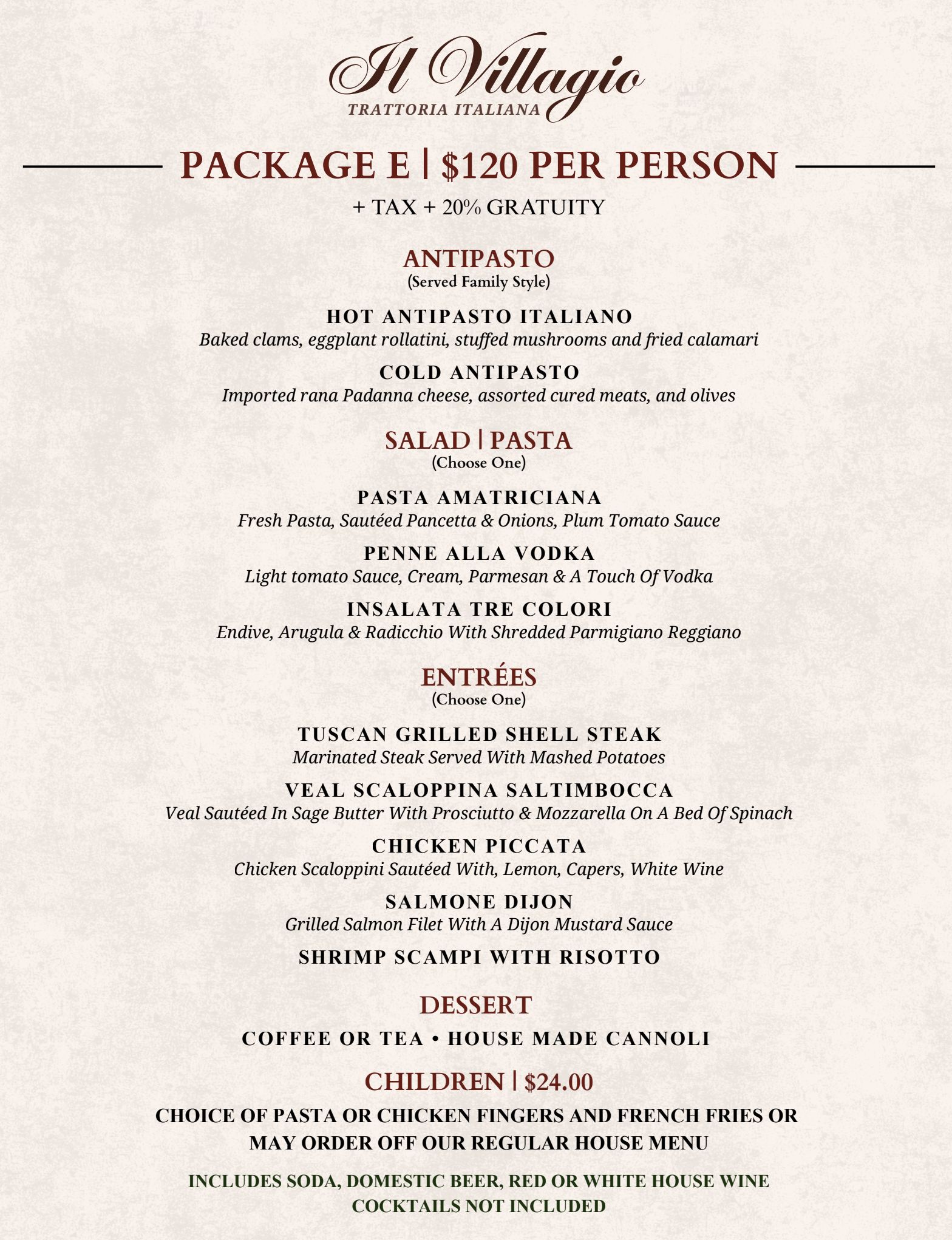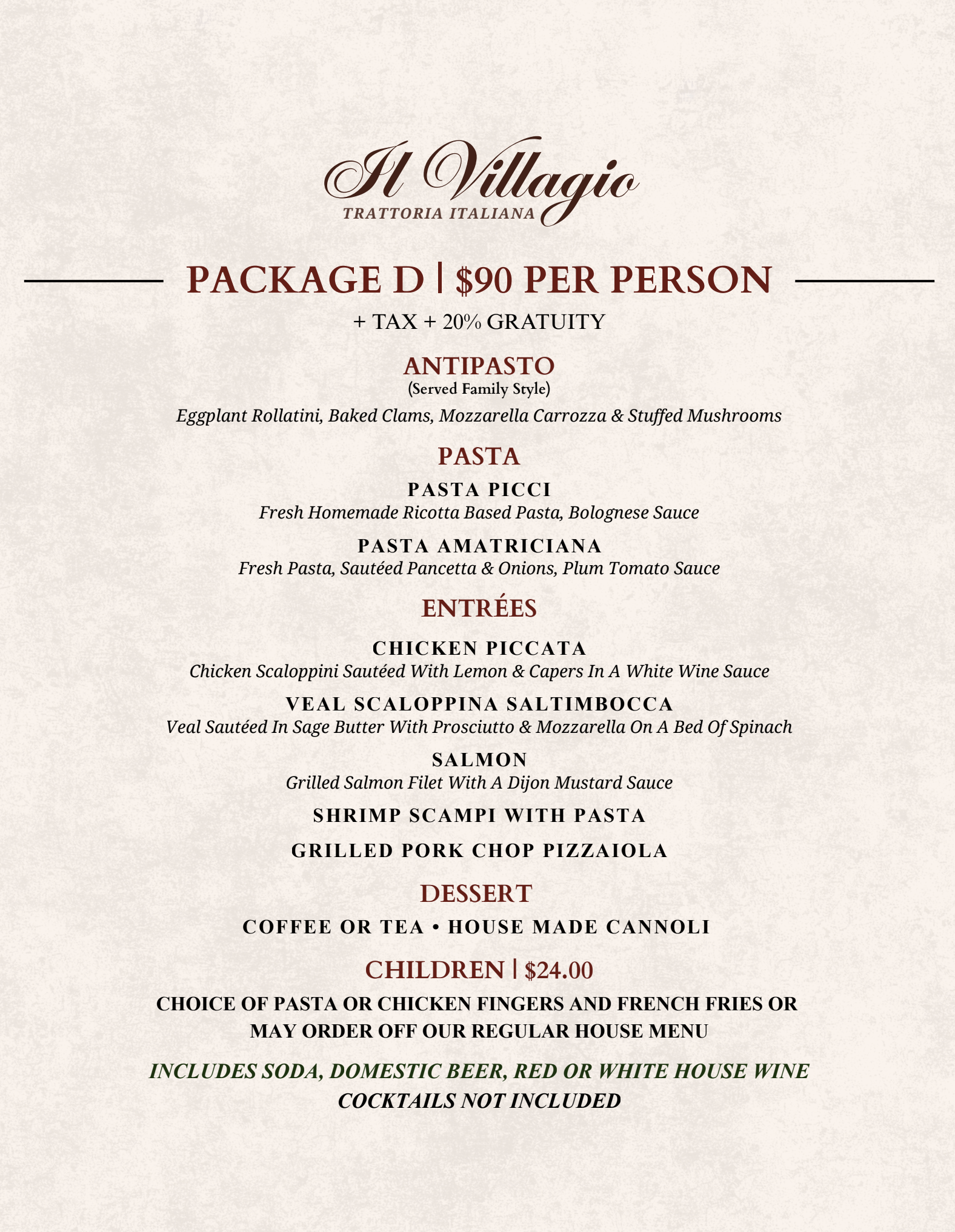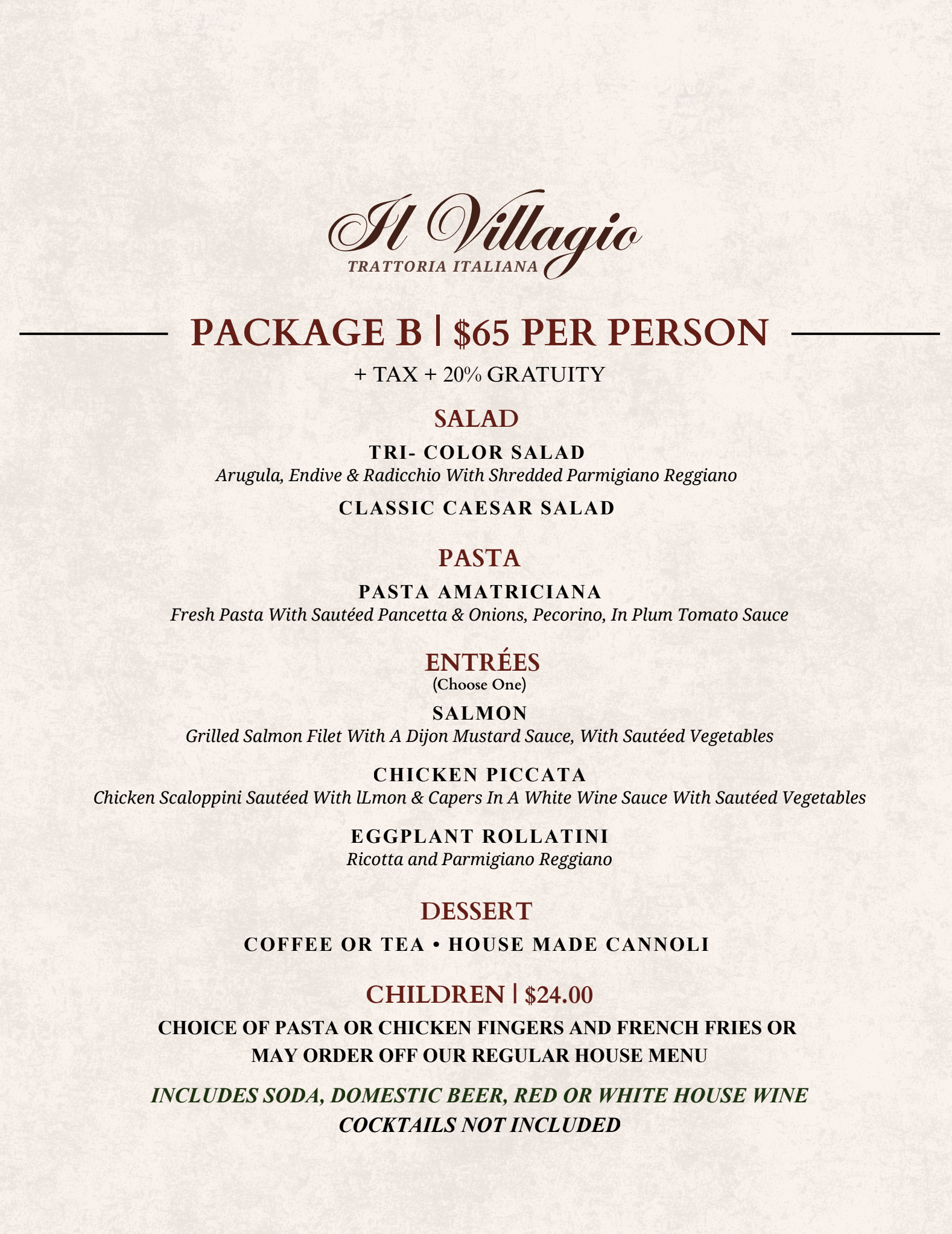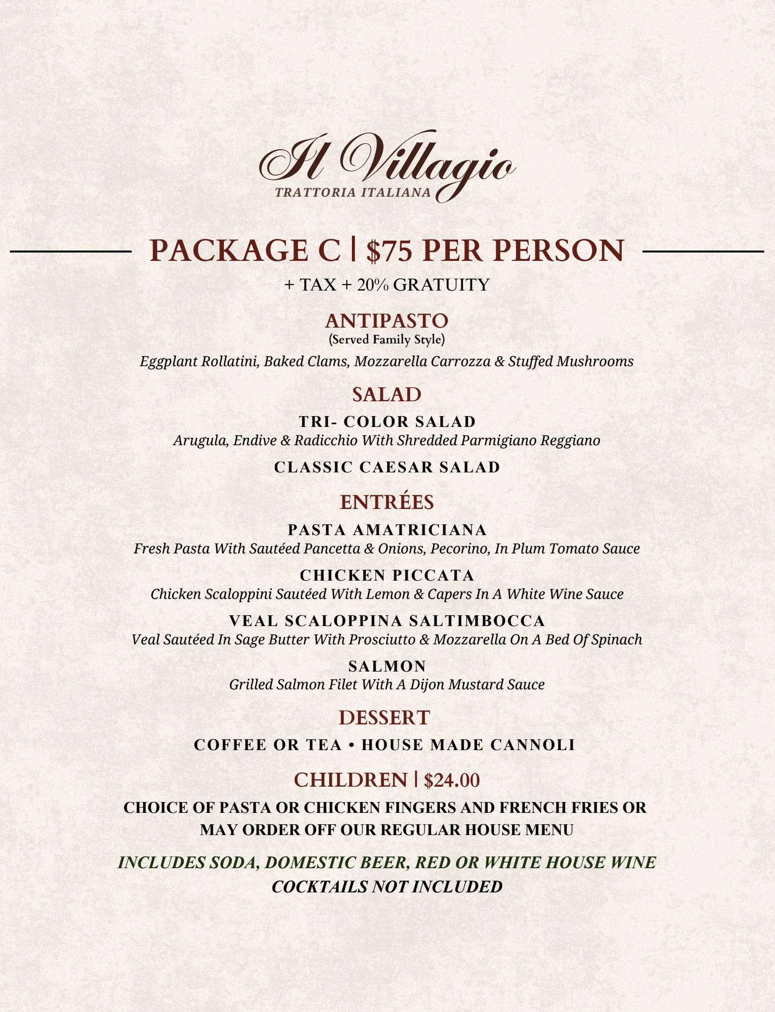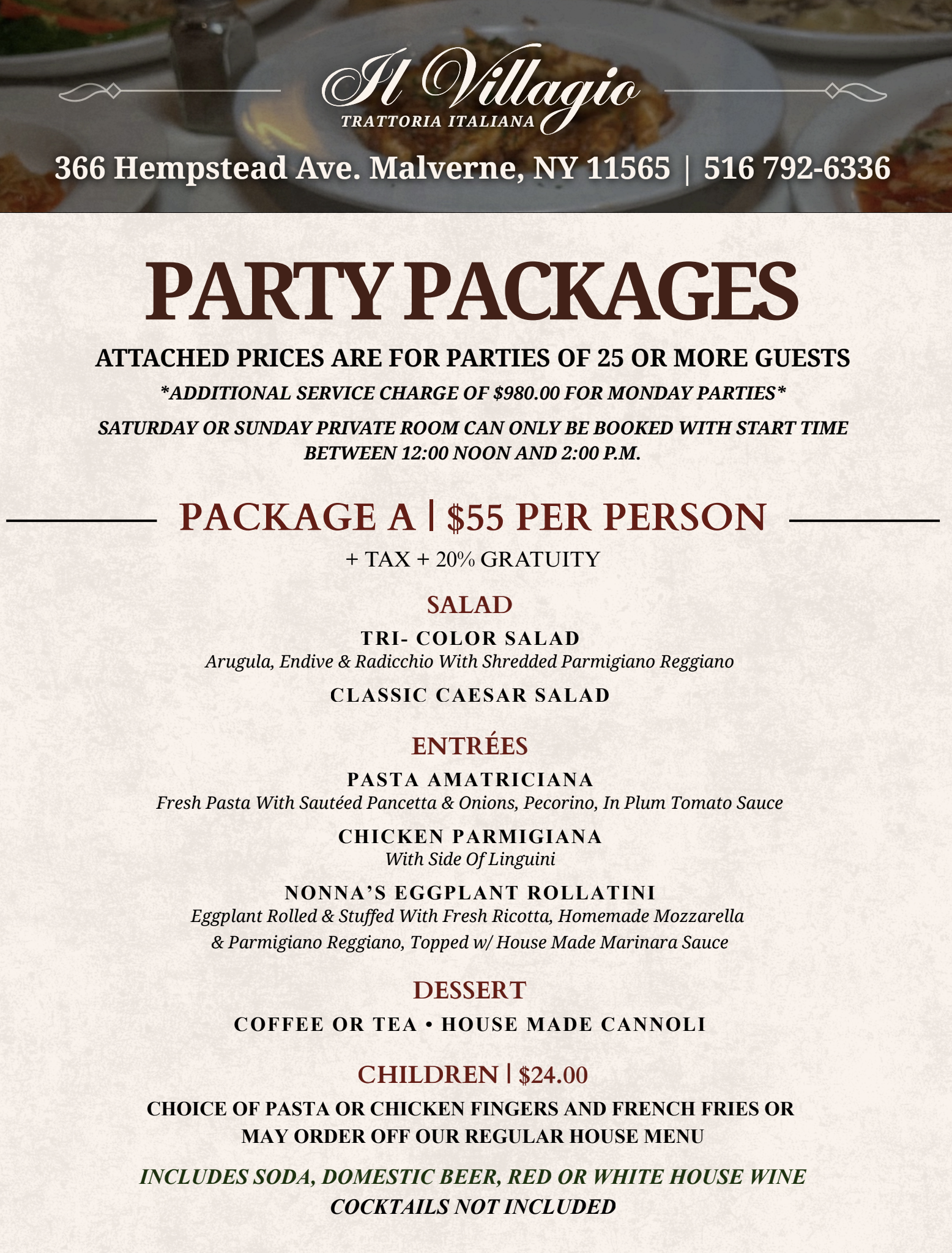 PRICES ARE FOR PARTIES OF 20 OR MORE GUEST’S - ADDITIONAL SERVICE CHARGE OF $775.00 FOR MONDAY PARTIES - PRIVATE ROOM CAN ONLY BE GAURANTTED ON SAT OR SUNDAY - START TIME BETWEEN 12:00 NOON AND 3:00 P.M.